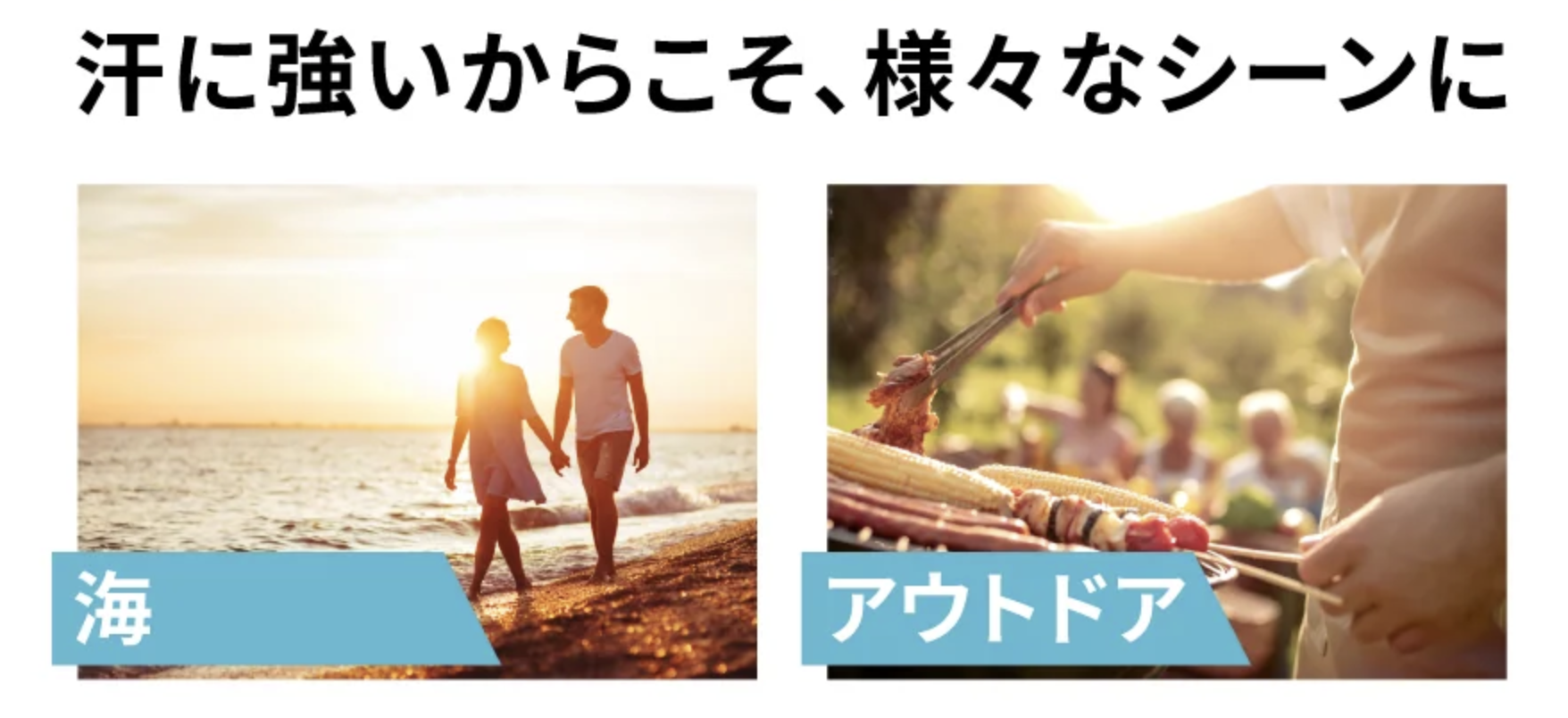 通勤中の汗、スポーツ中の動き、海辺やレジャーなど、水分に触れやすい場面でも