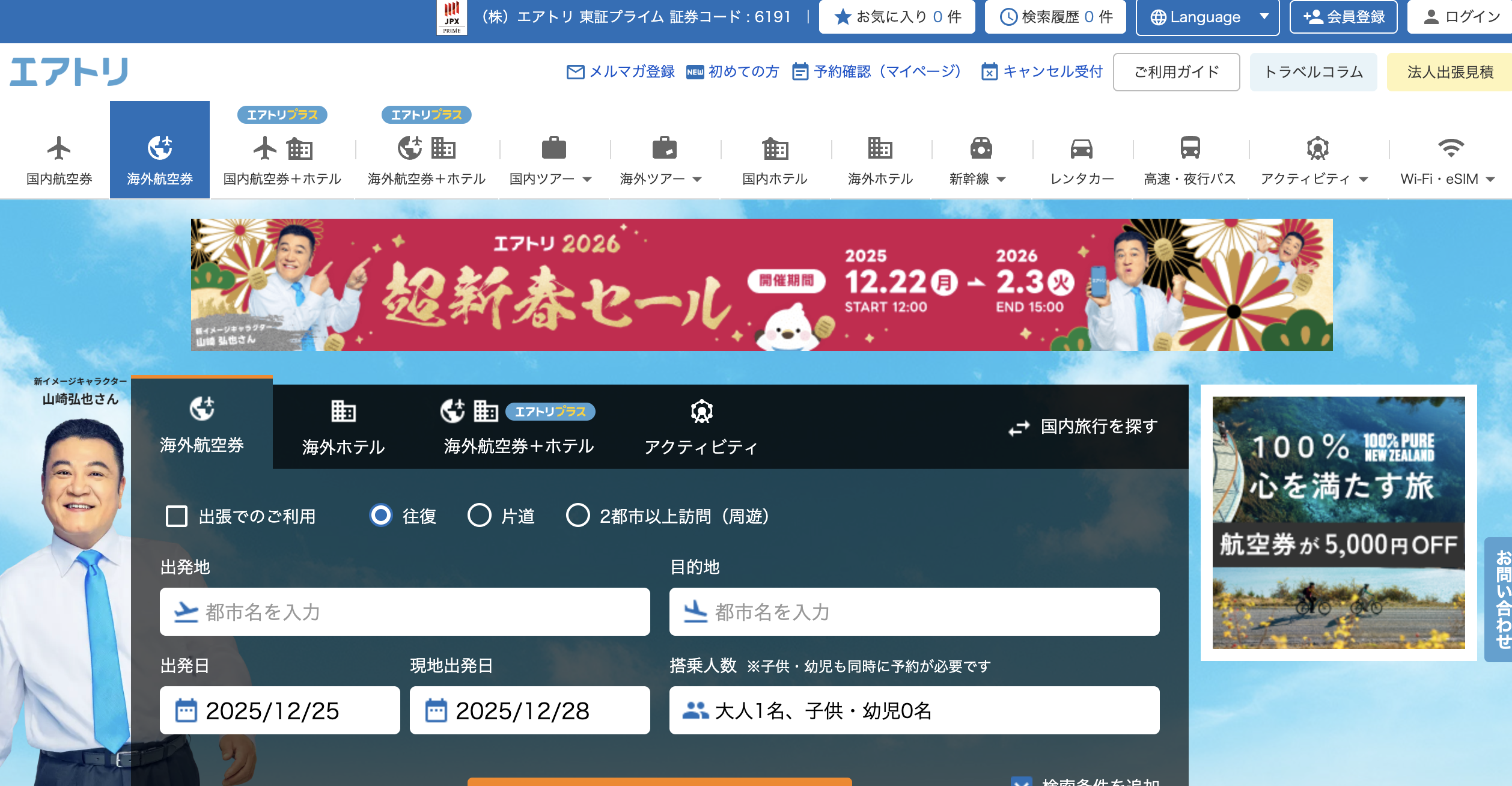 エアトリは、格安航空券をはじめとした渡航手配を分かりやすく比較・予約できるサービスです。航空券と宿泊を一体で考えられるため、旅行全体の計画を立てやすく、時間や手間を抑えたい方に向いています。