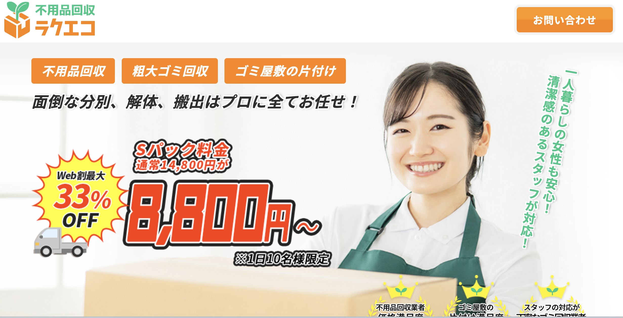 自治体の粗大ごみ回収は日程が限られていたり、運び出しが必要だったりと、想像以上に手間がかかります。こうした悩みをスムーズに解決してくれるサービスが、不用品回収ラクエコです。